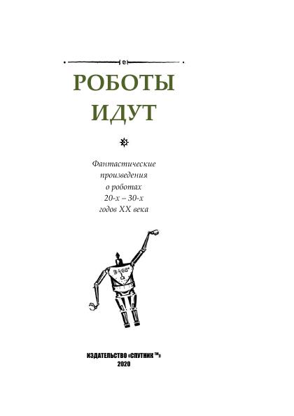 ВЛАДИМИР ВЛАДКО ИДУТ РОБОТЫ Социально-фантастическая повесть 5 А. РОМ (А. БЕЛЯЕВ) СЕЗАМ, ОТКРОЙСЯ! Фантастический рассказ 311 Э. ИНГОБОР ЭНРИК - 9 Отрывок из научно-фантастического романа «Этландия» 343 А. ВЛАДИМИРОВ АВТОМАТ-ШАХМАТИСТ Очерк 359 РАДИОПОЛИСМЭН Фантастический очерк 372 Д-р З. ИСКУССТВЕННЫЙ ЧЕЛОВЕК Очерк 375 ПРИЛОЖЕНИЕ ВЛАДИМИР ВЛАДКО ПОРАЖЕНИЕ ДЖОНАТАНА ГОВЕРСА Фантастический рассказ 393 А. РОМС (А. БЕЛЯЕВ) ЭЛЕКТРИЧЕСКИЙ СЛУГА Фантастический рассказ