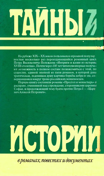В книгу вошли исторические романы Петра Полежаева «Престол и монастырь», «Лопухинское дело» и Евгения Карновича «На высоте и на доле». Романы «Престол и монастырь» и «На высоте и на доле» рассказывают о борьбе за трон царевны Софьи Алексеевны после смерти царя Федора Алексеевича. Показаны стрелецкие бунты, судьбы известных исторических личностей — царевны Софьи Алексеевны, юного Петра и других. Роман «Лопухинское дело» рассказывает об известном историческом факте: заговоре группы придворных во главе с лейб-медиком Лестоком, поддерживаемых французским посланником при дворе императрицы Елизаветы Петровны, против российского вице-канцлера Александра Петровича Бестужева с целью его...