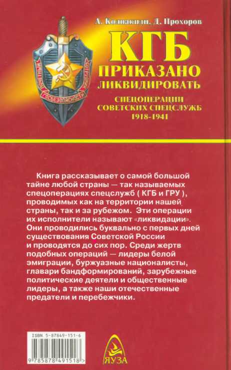 Книга рассказывает о самой большой тайне любой страны — так называемых спецоперациях спецслужб (КГБ и ГРУ), проводимых как на территории нашей страны, так и за рубежом. Эти операции их исполнители называют «литерными делами», а в просторечье они известны как «ликвидации». Они проводились буквально с первых дней существования Советской России и проводятся до сих пор. Среди жертв подобных операций — лидеры белой эмиграции, буржуазное националисты, главари бандформирований, зарубежные политические деятели и общественные лидеры, а также наши отечественные предатели и перебежчики.