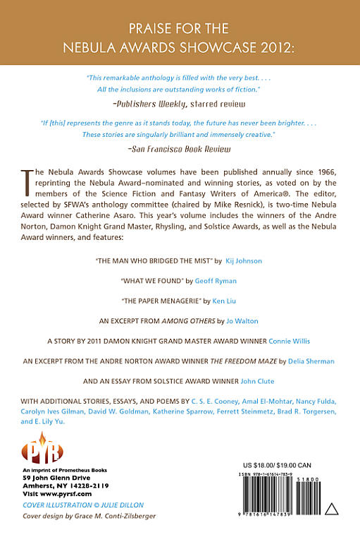 The Nebula Awards Showcase volumes have been published annually since 1966, reprinting the winning and nominated stories in the Nebula Awards, voted on by the members of the Science Fiction & Fantasy Writers of America(R). The editor selected by SFWA’s anthology committee (chaired by Mike Resnick) is two-time Nebula winner, Catherine Asaro. This year’s volume includes stories and excerpts by Connie Willis, Jo Walton, Kij Johnson, Geoff Ryman, John Clute, Carolyn Ives Gilman, Ferrett Steinmetz, Ken Liu, Nancy Fulda, Delia Sherman, Amal El-Mohtar, C. S. E. Cooney, David Goldman, Katherine Sparrow, E. Lily Yu, and Brad R. Torgersen. Review “Featuring writing of the highest...