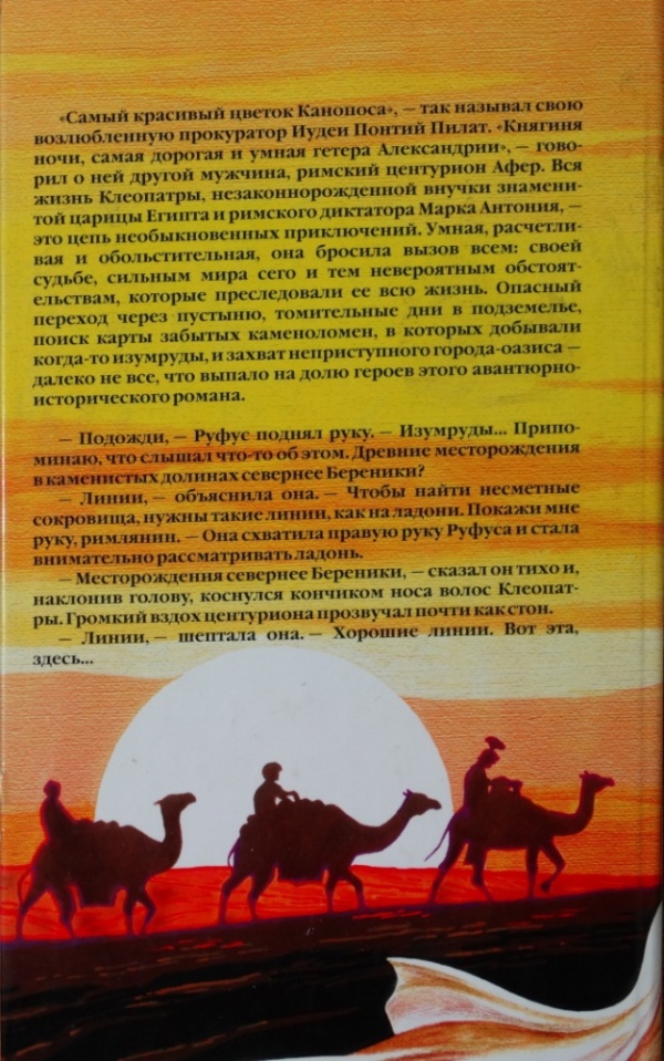 «Самый красивый цветок Канопоса», — так называл свою возлюбленную прокуратор Иудеи Понтий Пилат. «Княгиня ночи, самая дорогая и умная гетера Александрии», — говорил о ней другой мужчина, римский центурион Афер. Вся жизнь Клеопатры, незаконнорожденной внучки знаменитой царицы Египта и римского диктатора Марка Антония, — это цепь необыкновенных приключений. Умная, расчетливая и обольстительная, она бросила вызов всем: своей судьбе, сильным мира сего и тем невероятным обстоятельствам, которые преследовали ее всю жизнь. Опасный переход через пустыню, томительные дни в подземелье, поиск карты забытых каменоломен, в которых добывали когда-то изумруды, и захват неприступного города-оазиса — далеко...