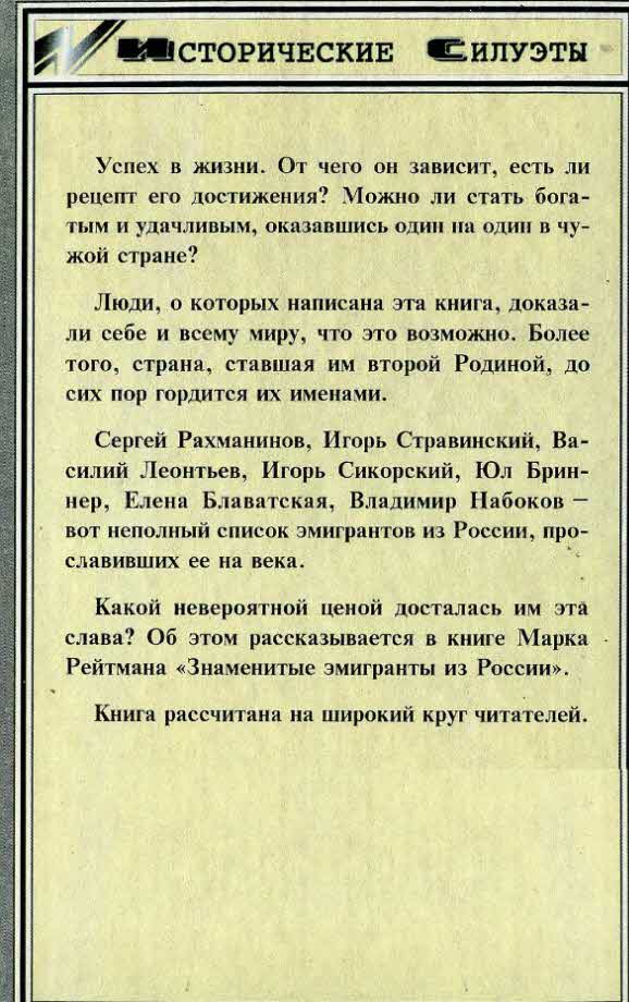 Игорь Сикорский, Юл Бриннер, Елена Блаватская, Владимир Набоков, Сергей Рахманинов, Игорь Стравинский, Василий Леонтьев - вот только часть знаменитых имен, вошедших в эту замечательную книгу. На долю этих людей выпала трудная судьба. Попав за рубеж, они оказались на грани выживания. Но сила воли, талант, вера в свои силы не дали им сломаться, а, наоборот, помогли подняться на, казалось бы, недосягаемую высоту и прославиться на весь мир. Воистину, человек может все, если очень захочет этого. Об этом в увлекательной форме и рассказывает эта книга, раскрыв которую, Вы уже не сможете оторваться от нее.