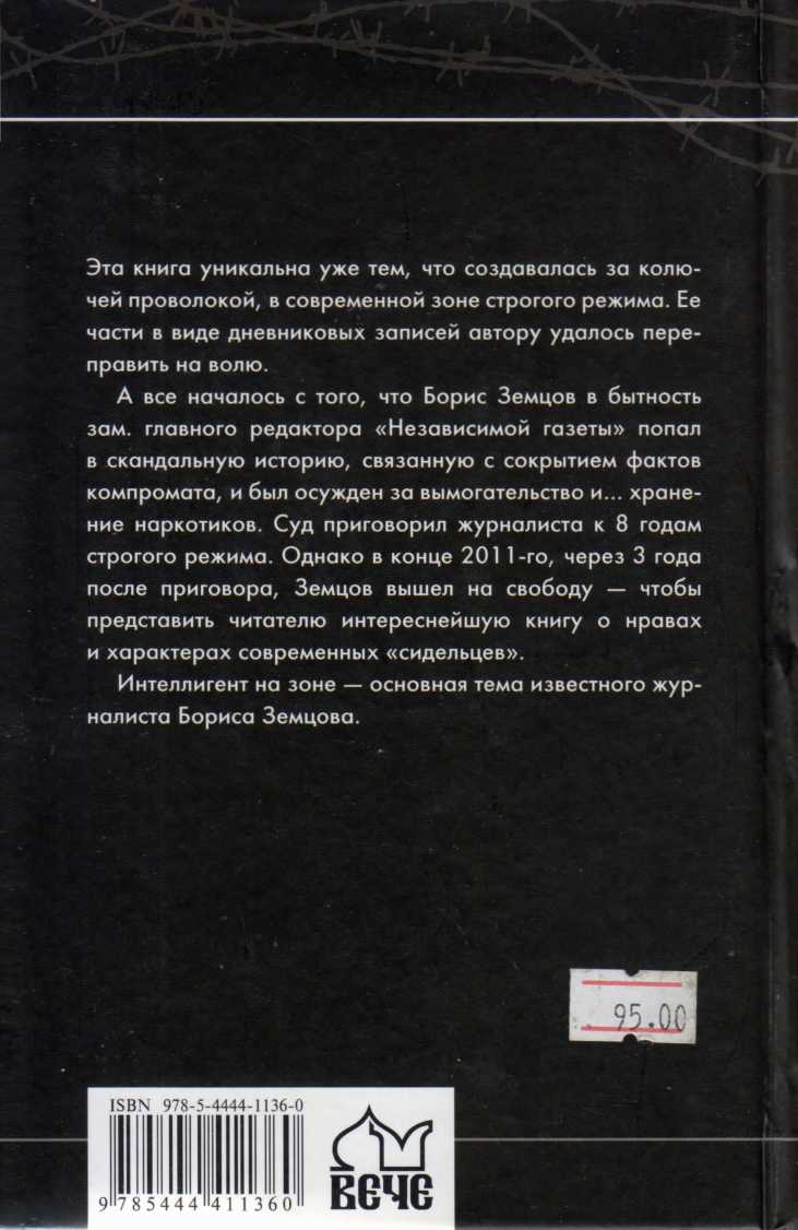 Эта книга уникальна уже тем, что создавалась за колючей проволокой, в современной зоне строгого режима. Ее части в виде дневниковых записей автору удалось переправить на волю. А все началось с того, что Борис Земцов в бытность зам. главного редактора «Независимой газеты» попал в скандальную историю, связанную с сокрытием фактов компромата, и был осужден за вымогательство и… хранение наркотиков. Суд приговорил журналиста к 8 годам строгого режима. Однако в конце 2011-го, через 3 года после приговора, Земцов вышел на свободу — чтобы представить читателю интереснейшую книгу о нравах и характерах современных «сидельцев». Интеллигент на зоне — основная тема известного журналиста Бориса...