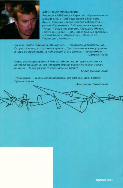 Александр Мильштейн — уроженец Харькова, по образованию математик, ныне живет в Мюнхене. Автор романов «Пиноктико», «Параллельная акция», «Серпантин». Его прозу называют находкой для интеллектуалов, сравнивают с кинематографом Фассбиндера, Линча, Вима Вендерса. Новый роман Мильштейна «Контора Кука» сам автор назвал «остальгическим вестерном». Видимо, имея в виду, что герой, молодой человек из России, пытается завоевать Европу, как когда-то его ровесники — Дикий Запад. На глазах у читателя творится динамичная картина из множества персон: художников, программистов, барменов, русских эмигрантов, немецких писателей и совсем каких-то странных существ…