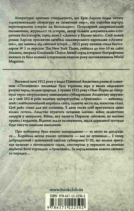 Эрик Ларсон – американский писатель, журналист, лауреат множества премий, автор популярных исторических книг. Среди них мировые бестселлеры: “В саду чудовищ. Любовь и террор в гитлеровском Берлине”, “Буря «Исаак»”, “Гром небесный” и “Дьявол в белом городе” (премия Эдгара По и номинация на премию “Золотой кинжал” за лучшее произведение нон-фикшн от Ассоциации детективных писателей). “Мертвый след” (2015) – захватывающий рассказ об одном из самых трагических событий Первой мировой войны – гибели “Лузитании”, роскошного океанского лайнера, совершавшего в апреле 1915 года свой 201-й рейс из Нью-Йорка в Ливерпуль. Корабль был торпедирован германской субмариной U-20 7 мая 1915 года и затонул за...
