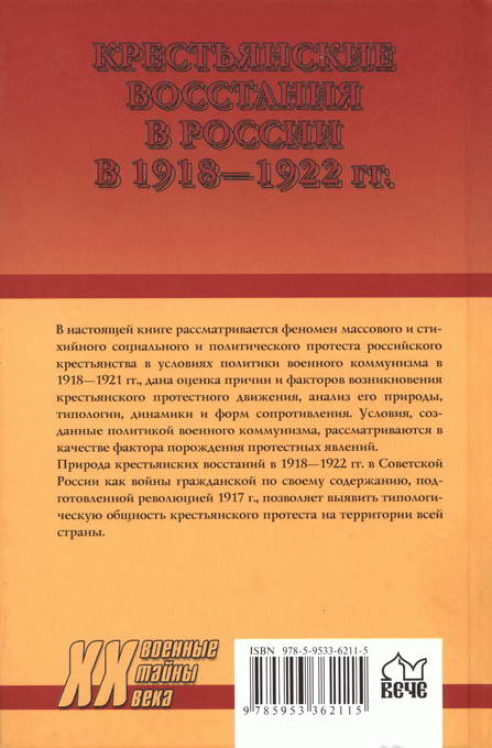 В настоящей книге рассматривается феномен массового и стихийного социального и политического протеста российского крестьянства в условиях политики военного коммунизма в 1918—1921 гг., дана оценка причин и факторов возникновения крестьянского протестного движения, анализ его природы, типологии, динамики и форм сопротивления. Условия, созданные политикой военного коммунизма, рассматриваются в качестве фактора порождения протестных явлений. Природа крестьянских восстаний в 1918—1922 гг. в Советской России как войны гражданской по своему содержанию, подготовленной революцией 1917 г., позволяет выявить типологическую общность крестьянского протеста на территории всей страны.