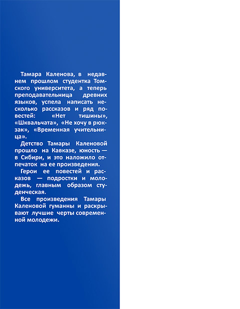 Тамара Каленова, в недавнем прошлом студентка Томского университета, а теперь преподавательница древних языков, успела написать несколько рассказов и ряд повестей: «Нет тишины», «Шквальчата», «Не хочу в рюкзак», «Временная учительница». Детство Тамары Каленовой прошло на Кавказе, юность — в Сибири, и это наложило отпечаток на ее произведения. Герои ее повестей и рассказов — подростки и молодежь, главным образом студенческая. Все произведения Тамары Каленовой гуманны и раскрывают лучшие черты современной молодежи.