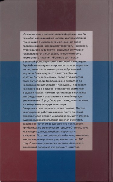 «Брачные узы» — типично «венский» роман, как бы случайно написанный на иврите, и описывающий граничащие с извращением отношения еврея-парвеню с австрийской аристократкой. При первой публикации в 1930 году он заслужил репутацию «скандального» и был забыт, но после второго, посмертного издания, «Брачные узы» вошли в золотой фонд ивритской и мировой литературы. Герой Фогеля — чужак в огромном городе, перекати-поле, невесть какими ветрами заброшенный на улицы Вены откуда-то с востока. Как ни хочет он быть здесь своим, город отказывается стать ему опорой. Он бесконечно скитается по невымышленным улицам и переулкам, переходит из одного кафе в другое, отдыхает на скамейках в садах и парках,...
