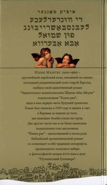 Ицик Мангер (1902–1969) — крупнейший еврейский поэт, писавший на идише. Родился в Коломые (Галиция), детство провел в Черновцах, затем жил в Яссах, Бухаресте, Варшаве, Париже, Лондоне и Нью-Йорке. Умер в Израиле, куда переехал незадолго до смерти. Мангер, последний романтический поэт старой Европы, снабдил свой единственный роман «Удивительное жизнеописание Шмуэл-Абы Аберво» подзаголовком «Книга рая», видя в нем первую часть будущей трилогии. Роман был написан в 1939 г., перед самым началом Второй мировой войны. Книга вышла в свет в Варшаве за неделю до того, как немецкие бомбы упали на город. «Изгнание из рая» стало уже не завязкой романа, а свершившимся фактом истории. Две другие...