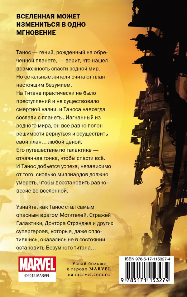 Танос — гений, рожденный на обреченной планете, — верит, что нашел возможность спасти родной мир. Но остальные жители считают план настоящим безумием. На Титане практически не было преступлений и не существовало смертной казни, и Таноса навсегда сослали с планеты. Изгнанный из родного мира, он все равно полон решимости вернуться и осуществить свой план… любой ценой. Его путешествие по галактике — отчаянная гонка, чтобы спасти всё. И Танос добьется успеха, независимо от того, сколько миллиардов должно умереть, чтобы восстановить равновесие во вселенной.