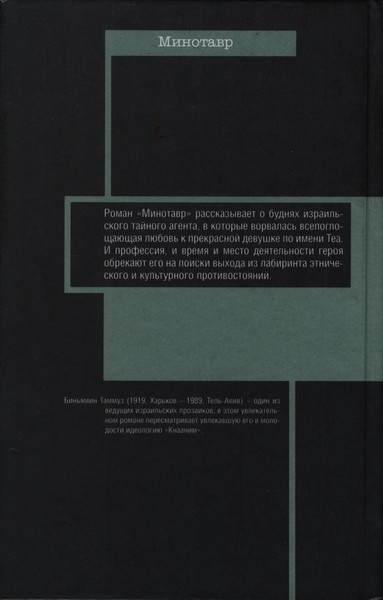 Роман Минотавр рассказывает о буднях израильского тайного агента, в которые ворвалась всепоглощающая любовь к прекрасной девушке по имени Теа. И профессия, и время и место деятельности героя обрекают его на поиски выхода из лабиринта этнического и культурного противостояний. Биньямин Таммуз (1919, Харьков — 1989, Тель Авив) — один из ведущих израильских прозаиков, в этом увлекательном романе пересматривает увлекавшую его в молодости идеологию «Кнааним».