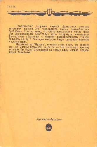 В сборник вошли повести и рассказы советских и зарубежных писателей: Г.Альтова, Р.Подольного, П.Амнуэля, Р.Брэдбери, Г.Каттнера, Л.Биггла-младшего, Э.Донаджо, Н.Нильсена и многих других. Для широкого круга читателей. СОДЕРЖАНИЕ: Preludium Владимир Одоевский — 4338-й год (отрывок) Мы с тобой — одной крови Иржи Берковец — АУТОСОНИДО (перевод Е.Аникст) Герберт Голдстоун — ВИРТУОЗ (перевод В.Волина) Эмио Донаджо — ЧУДИЩЕ И ДЖАЗ (перевод Л.Вершинина) Бёрье Круна — КОСМИЧЕСКАЯ МУЗЫКА (перевод А.Афиногеновой) Чеслав Хрущевский — ИСЧЕЗЛА МУЗЫКА (перевод Е.Вайсброта) Генри Каттнер — МУЗЫКАЛЬНАЯ МАШИНА (перевод В.Боканова) Павел Амнуэль — ДАЛЕКАЯ...