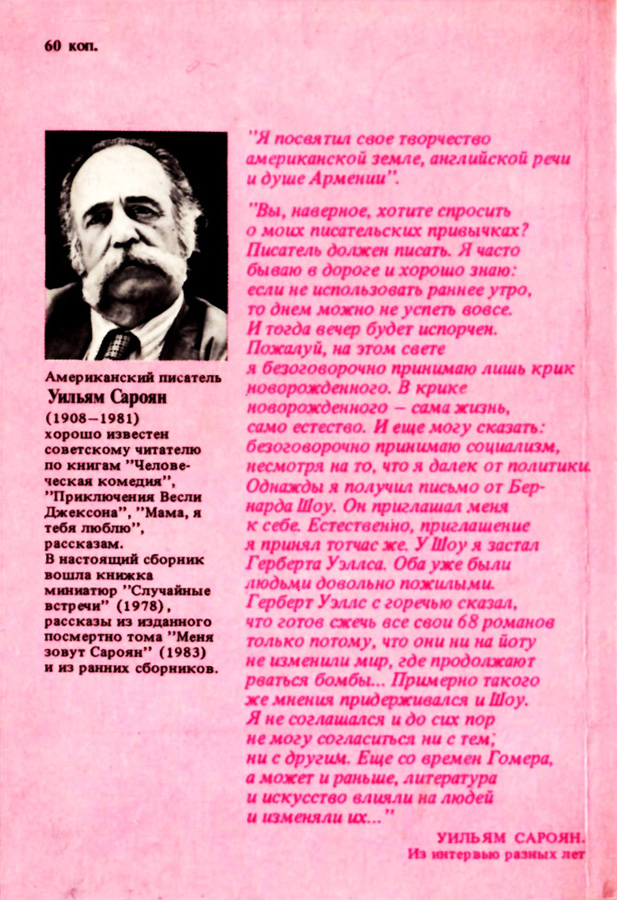 «Случайные встречи» — одна из последних книг американского писателя, в которой автор рассказывает о тех, с кем ему довелось встретиться за свою долгую жизнь, о смешных и грустных эпизодах, непрерывающаяся цепь которых и есть бытие человека. В сборник вошли также рассказы разного периода, в том числе рассказы, изданные отдельной книжкой после смерти писателя, — «Меня зовут Сароян».