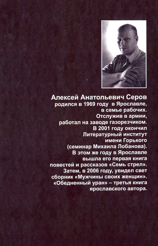 Российский читатель уже знаком с произведениями ярославского прозаика Алексея Серова. В 2001 году увидел свет сборник рассказов «Семь стрел», а через пять лет — в 2006 — сборник «Мужчины своих женщин». «Обеднённый уран» — третья книга автора. Рассказы, собранные в ней, различны и по тематике, и по жанру, и по авторскому «я» в характерах их героев. Но все рассказы (и маленькую повесть) книги объединяет главное: законченность сюжета, четкий психологический портрет главного героя. Творчество Алексея Серова уже по достоинству оценено читателями и критиками. По итогам 2013 года Алексею Серову присуждена премия имени Леонида Леонова, учрежденная журналом «Наш современник».