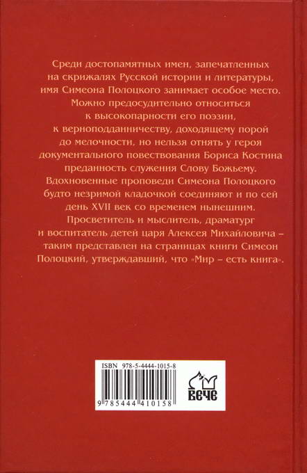 Среди достопамятных имен, запечатленных на скрижалях русской истории и литературы, имя Симеона Полоцкого занимает особое место. Можно предосудительно относиться к высокопарности его поэзии, к верноподданничеству, доходящему норой до мелочности, но нельзя отнять у героя документального повествования Бориса Костина преданность служения Слову Божьему. Вдохновенные проповеди Симеона Полоцкого будто незримой кладочкой соединяют и по сей день XVII век со временем нынешним. Просветитель и мыслитель, драматург и воспитатель детей царя Алексея Михайловича — таким представлен на страницах книги Симеон Полоцкий, утверждавший, что «Мир — есть книга».