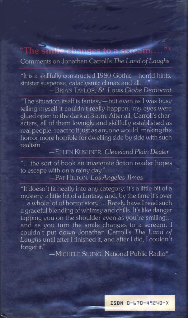 Джонатан Кэрролл — американец, живущий в Вене. Его называют достойным продолжателем традиций, как знаменитого однофамильца, так и Г. Г. Маркеса, и не без изрядной примеси Ричарда Баха. «Страна смеха» — дебютный роман Кэрролла, до сих пор считающийся многими едва ли не вершиной его творчества. Это книга о любви как методе художественного творчества, о лабиринтах наваждения и о прикладной зоолингвистике (говорящих собаках).