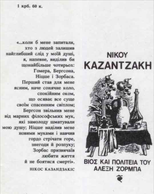 Герой роману видатного грецького письменника (1883—1957) — людина бурхливої енергії, життєлюб і мрійник, веселун і дотепник. У всіх своїх вчинках він керується більше серцем, ніж розумом, з однаковою пристрастю віддається коханню, мистецтву, ремеслу і заради свого захоплення готовий на будь-які жертви. Він переконаний, що найбільша цінність на світі — це людське життя, і ніхто не має права важити на нього, тому прагне бути незалежним від усього, що обмежує свободу людини. За цим романом знято славнозвісний американський фільм «Грек Зорба».