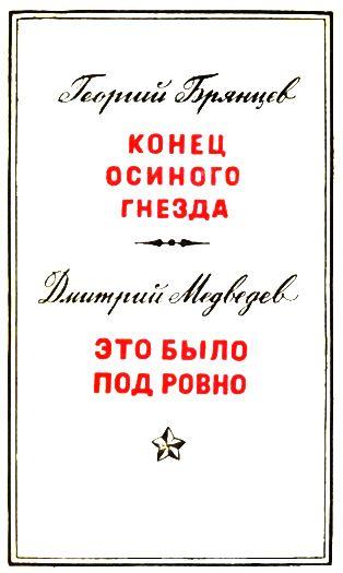 Медведев Д. Это было под Ровно. Брянцев Г. Конец «осиного гнезда» / Ил, М. Ф. Петрова.—М.: Правда, 1987—496 с., ил. В книгу вошли роман Героя Советского Союза, писателя Д. Н. Медведева «Это было под Ровно» и повесть советского писателя Г. М. Бряндев а «Конец «осиного гнезда», рассказывающие о героической борьбе советских людей с немецко-фашистскими захватчиками в тылу врага в годы Великой Отечественной войны. [collapse collapsed title=Содержание] Дмитрий Медведев. Это было под Ровно (роман, иллюстрации М.Ф. Петрова), стр 3-198 Георгий Брянцев. Конец «осиного гнезда» (повесть, иллюстрации М.Ф. Петрова), стр 199-495[/collapse]