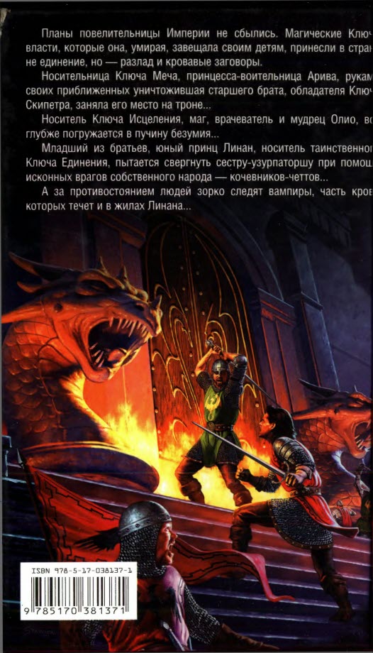 Планы повелительницы Империи не сбылись. Магические Ключи власти, которые она, умирая, завешала своим детям, принесли в страну не единение, но — разлад и кровавые заговоры. Носительница Ключа Меча, принцесса-воительница Арива, руками своих приближенных уничтожившая старшего брата, обладателя Ключа Скипетра, заняла его место на троне… Носитель Ключа Исцеления, маг, врачеватель и мудрец Олио все глубже погружается в пучину безумия… Младший из братьев, юный принц Линан, носитель таинственного Ключа Единения, пытается свергнуть сестру-узурпаторшу при помощи исконных врагов собственного народа — кочевников-четтов… А за противостоянием людей зорко следят вампиры, часть крови...