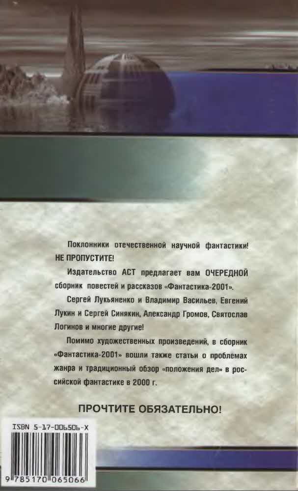 Поклонники отечественной научной фантастики! НЕ ПРОПУСТИТЕ! Издательство ACT предлагает вам ОЧЕРЕДНОЙ сборник повестей и рассказов «Фантастика-2001». Сергей Лукьяненко и Владимир Васильев, Евгений Лукин и Сергей Синякин, Александр Громов, Святослав Логинов и многие другие! Помимо художественных произведений, в сборник «Фантастика-2001» вошли также статьи о проблемах жанра и традиционный обзор «положения дел» в российской фантастике в 2000 г.