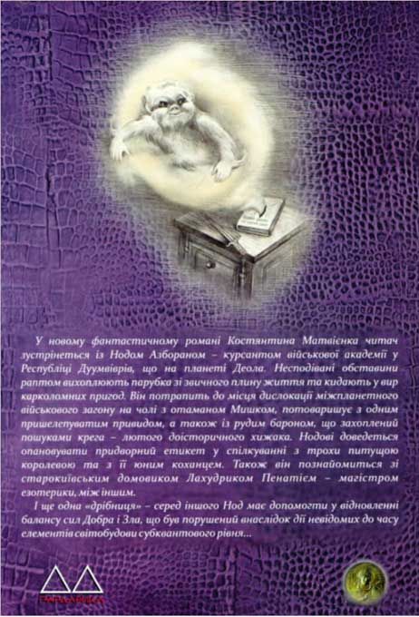 У новому фантастичному романі Костянтина Матвієнка читач зустрінеться із Нодом Азбораном — курсантом військової академії у Республіці Дуумвіврів, що на планеті Деола. Несподівані обставини раптом вихоплюють парубка зі звичного плину життя та кидають у вир карколомних пригод. Він потрапить до місця дислокації міжпланетного військового загону на чолі з отаманом Мишком, потоваришує з одним пришелепуватим привидом, а також із рудим бароном, що захоплений пошуками крега — лютого доісторичного хижака. Нодові доведеться опановувати придворний етикет у спілкуванні з трохи питущою королевою та з її юним коханцем. Також він познайомиться зі старо київським домовиком Лахудриком Пенатієм — магістром...