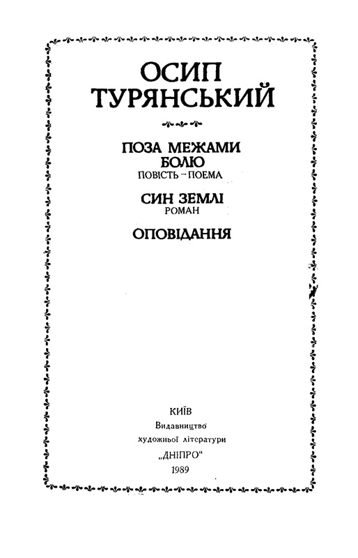 Турянський Осип Васильович (1880–1933) — західноукраїнський прозаїк, який працював також у поетичних і критичних жанрах, перекладав з іноземних мов. У виданні вмішено вибрані твори письменника. Повість-поема «Поза межами болю» вважається одним з кращих літературних творів, в яких змальовано першу світову війну і викрито капіталістичний лад, що її породив. Роман «Син землі» привертає увагу непримиренністю до соціального й національного гноблення, приваблює благородними почуттями і помислами головного героя. Окремим розділом представлено оповідання.