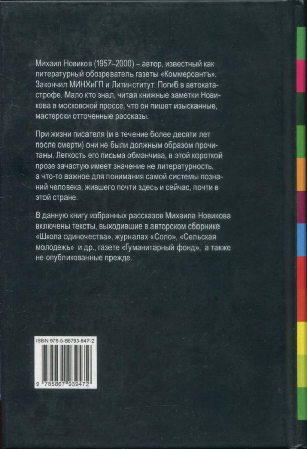 Михаил Новиков (1957–2000) — автор, известный как литературный обозреватель газеты «Коммерсантъ». Окончил МИНХиГП и Литинститут. Погиб в автокатастрофе. Мало кто знал, читая книжные заметки Новикова в московской прессе, что он пишет изысканные, мастерски отточенные рассказы. При жизни писателя (и в течение более десяти лет после смерти) они не были должным образом прочитаны. Легкость его письма обманчива, в этой короткой прозе зачастую имеет значение не литературность, а что-то важное для понимания самой системы познаний человека, жившего почти здесь и сейчас, почти в этой стране. В данную книгу избранных рассказов Михаила Новикова включены тексты, выходившие в авторском сборнике «Школа...