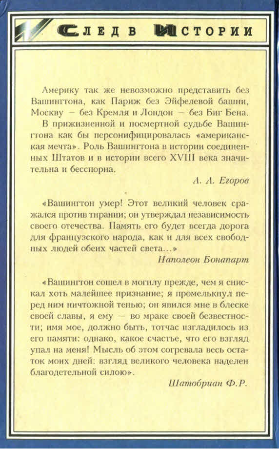 Книга Н. Я. Яковлева о Джордже Вашингтоне, вышедшая в свет еще в 1973 г., и по сей день остается единственной обстоятельной биографией великого американца, опубликованной на русском языке. Предпринимая ее переиздание, издательство исходило прежде всего из этого обстоятельства. Впрочем, эта книга, написанная известным специалистом по истории США, адресована широкому кругу читательской аудитории. Легкий язык, обилие интересных фактов, большая эрудиция автора, его несомненный литературный талант, — все это сделает «свидание с Вашингтоном» приятным и познавательным для всякого, кто возьмет в руки эту книгу.