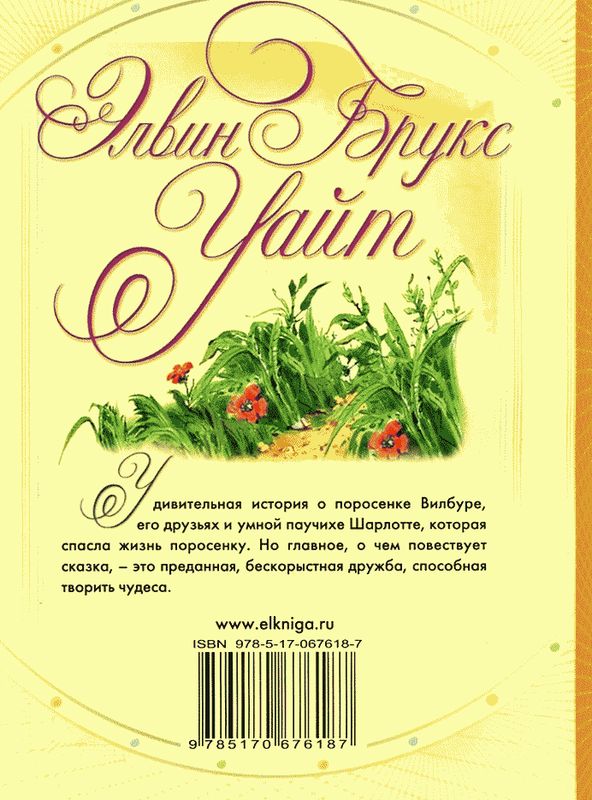 Ця повість-казка, написана в 1952 році американським письменником Елвіном Бруксом Вайтом, стала однією з найулюбленіших дитячих книжок в усьому світі, тому що в ній ідеться про справжню дружбу, відданість, невичерпні вигадки й веселі пустощі. Маленька дівчинка на ім'я Ферн урятувала і виростила поросятка Вілбера як свого домашнього улюбленця. На фермі, куди згодом відправили Вілбера, він потоваришував з багатьма тваринами. Але найвідданіший його друг — гарненька і розумна павучиха Шарлотта — вдруге врятувала Вілберове життя, а як — ви дізнаєтеся самі, прочитавши цю цікаву книжку. Для дітей дошкільного і молодшого шкільного віку. З англійської переклав Олександр Мокровольський. ...