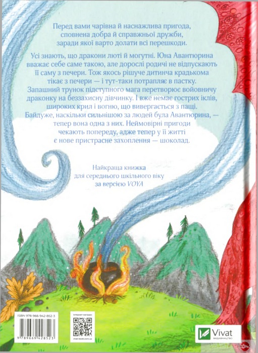 Перед вами чарівна й наснажлива пригода, сповнена добра й справжньої дружби, заради якої варто долати всі перешкоди. Усі знають, що дракони люті й могутні. Юна Авантюрина вважає себе саме такою, але дорослі родичі не відпускають її саму з печери. Тож якось рішуче дитинча крадькома тікає з печери — і тут-таки потрапляє в пастку. Запашний трунок підступного мага перетворює войовничу драконку на беззахисну дівчинку. І вже немає гострих іклів, широких крил і вогню, що вивергається з пащі. Байдуже, наскільки сильнішою за людей була Авантюрина, — тепер вона одна з них. Неймовірні пригоди чекають попереду, адже тепер у її житті, окрім слабкого тіла, є нове пристрасне захоплення — шоколад.