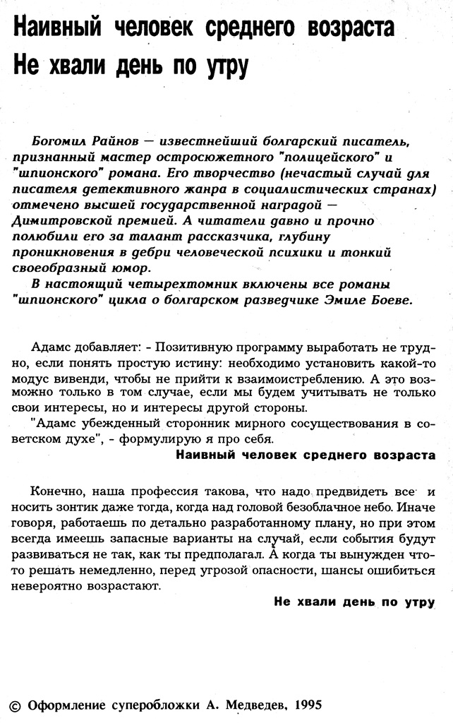 Читатели давно смогли оценить по достоинству острый детективный сюжет, тонкий ироничный стиль в знаменитых «шпионских» романах о болгарском разведчике Эмиле Боеве, периодически появлявшихся в журналах, приложениях, сборниках. В данном издании впервые в России собран весь легендарный цикл; Роман «Наивный человек среднего возраста» публикуется на русском языке впервые.
