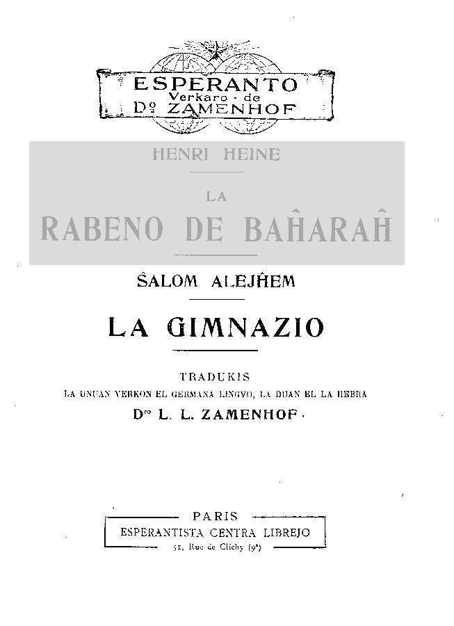 La Zamenhofa traduko de «La gimnazio» unue aperis en la gazeto «La Revuo» en 1909–1910. Libroforme ĝi estis publikigita unue en 1924 kune kun «La rabeno de Baĥaraĥ» en unu volumo. La ĉi-tiea teksto sekvas la duan eldonon de 1929.
