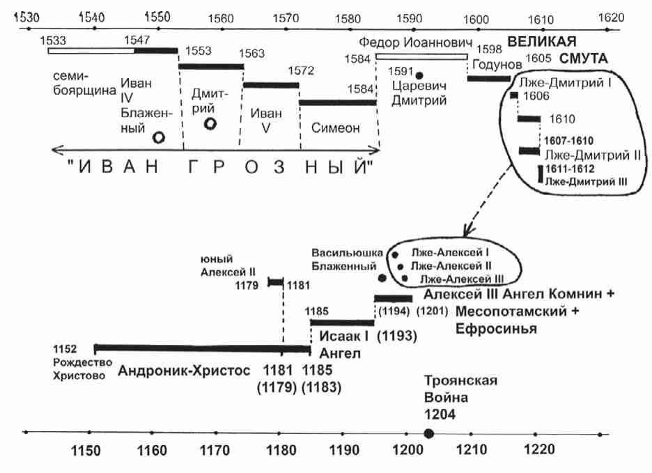 Авторы обработали важные блоки истории Европы и Византии XI–XVII веков. Знаменитые византийские деятели – Василий Богомил и Иоанн Итал оказываются яркими отражениями императора Андроника-Христа, то есть князя Андрея Боголюбского из XII века. Например, проясняется знаменитый евангельский сюжет: почему рядом с Христом на Голгофе были распяты два «разбойника». Оказывается, Благоразумный разбойник символизирует учеников Христа, продолжавших почитать Его после суда. А Безумный разбойник – это образ учеников, которые отказались от Христа. Обнаружены протоколы суда над Христом. История знаменитой Жанны д’Арк и французского короля Карла VI – это фантомное отражение жизнеописаний царицы Елены...