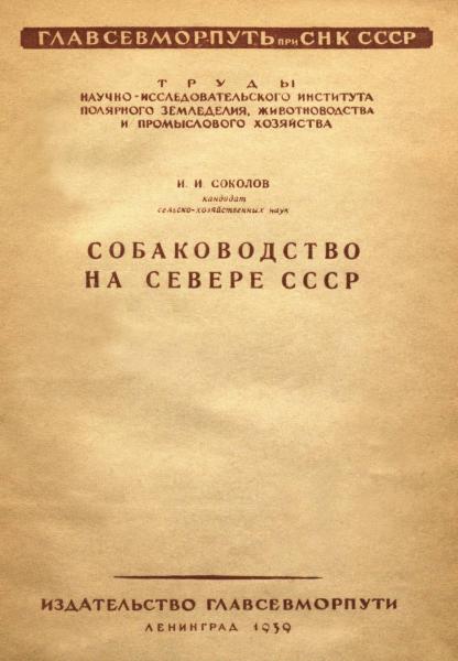 И. И. Соколов, кандидат сельскохозяйственных наук Собаководство на Севере СССР ГЛАВСЕВМОРПУТЬ при СНК СССР Труды Научно-исследовательского института полярного земледелия, животноводства и промыслового хозяйства Серия "Промысловое хозяйство", вып. 9 Под редакцией проф. Н. А. Смирнова Издательство Главсевморпути Ленинград 1939 Отв. редактор А. А. Кальниболоцкий. Техн. редактор М. М. Петерсон. Корректор С. Н. Томина. Сдано в набор 19 июля 1939 г. Подписано к печати 23 ноября 1939 г. Бумага 70X108. Печ. л. 5 3/4. Бум. л. 2 7/8. Уч.-авт. л. 8. 110000 тип. зн. в 1 бум. л. Леноблгорлит № 5593. Тираж 750 зкз. Издание № 174. Инд. П-191. Заказ № 2735. Типография "Коминтерн"....