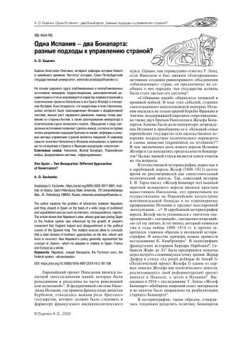На основе широкого круга опубликованных и неопубликованных источников: мемуаров, корреспонденции, дипломатической документации в статье анализируется характер взаимоотношений и политические проекты Наполеона и его брата Жозефа в отношении Испании. Констатируется, что коррективы в план Наполеона, целью которого было присоединение Испании к федеративной системе, вносил рост народного движения, помощь этому движению со стороны Англии, а также разочарование императора в политическом курсе испанского короля. Обращение к ряду синхронных источников позволяет сделать вывод, согласно которому четкое разделение подходов братьев по линии: реформы и силовые методы управления страной является ловушкой....