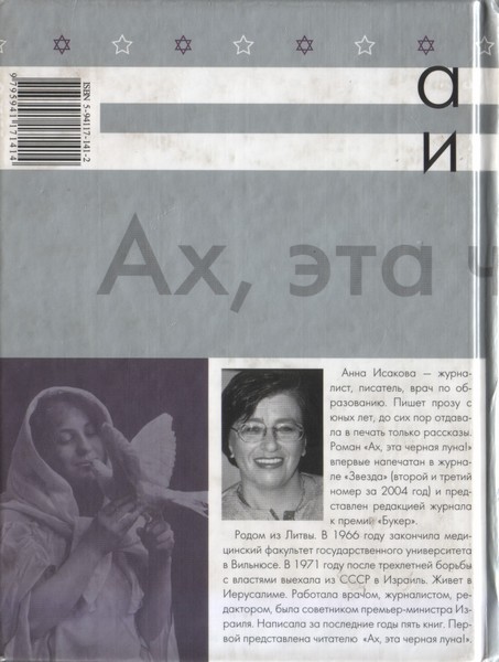 Анна Исакова — публицист, прозаик. Пишет на трех языках: русском, иврите, английском. Рассказы на русском языке публиковались во многих европейских журналах и в журнале «Нева». В 2004 г. в «Звезде» был опубликован ее роман «Ах, эта черная луна!». Живет в Иерусалиме.