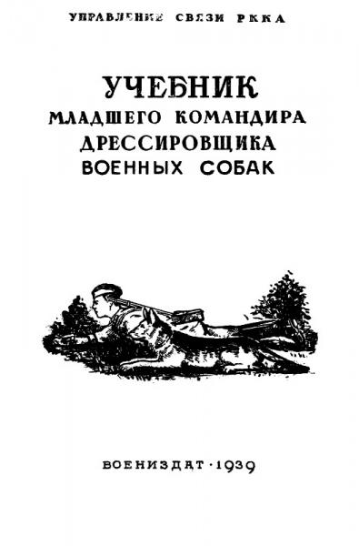 Управление связи РККА. Учебник младшего командира-дрессировщика военных собак. Воениздат 1939 Учебник включает основы анатомии и физиологии собак, способы их дрессировки, содержания, строевой подготовки вожатого с собакой, подготовки собак для специальных служб, тактического применения и главнейшие болезни собак и методы их лечения. Учебник предназначен для школ младшего командного состава связи — собаководства и голубеводства — и младших командиров-дрессировщиков военных собак частей и подразделений РККА. Кроме того, учебник может быть использован как пособие для клубных кружков и школ служебного собаководства Осоавиахима. Книга составлена коллективом авторов под общей редакцией...
