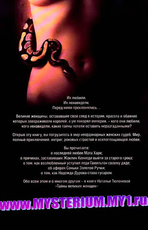 Их любили Их ненавидели Перед ними преклонялись… Великие женщины, оставившие свои след в истории, красота и обаяние которых завораживали королей, а ум покорял империи — кого они любили, кого ненавидели, какие тайны хотели оставить неразгаданными? Открыв эту книгу вы погрузитесь в мир неординарных женских судеб Мир, полный приключений, интриг, роковых страстей и всепоглощающей любви. Вы прочитаете о последней любви Мата-Хари; о причинах, заставивших Жаклин Кеннеди выйти замуж в старого грека; о том, как возлюбленный уступил дели Гамильтон своему дяде; об аферах Соньки Золотой Ручки; о том, как Надежда Дурова стала гусаром. Обо всем этом и...