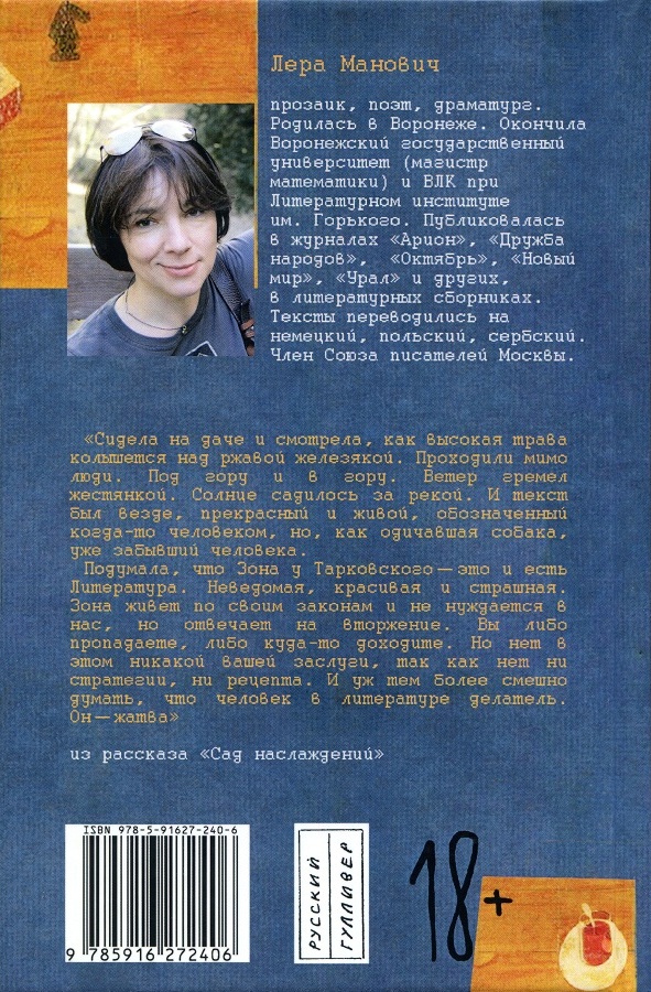 УДК 821.161.1-1 ББК 84(2 Рос=Рус)6-44 М23 В оформлении обложки использована картина Давида Штейнберга Манович, Лера Первый и другие рассказы. — М., Русский Гулливер; Центр Современной Литературы, 2015. — 148 с. ISBN 978-5-91627-154-6 Проза Леры Манович как хороший утренний кофе. Она погружает в задумчивую бодрость и делает тебя соучастником тончайших переживаний героев, переданных немногими точными словами, я бы даже сказал — точными обиняками. Искусство нынче редкое, в котором чувствуются отголоски когда-то хорошо усвоенного Хэмингуэя, а то и Чехова. Материальная, чувственно воспринимаемая и переживаемая деталь играет у Манович ту же...