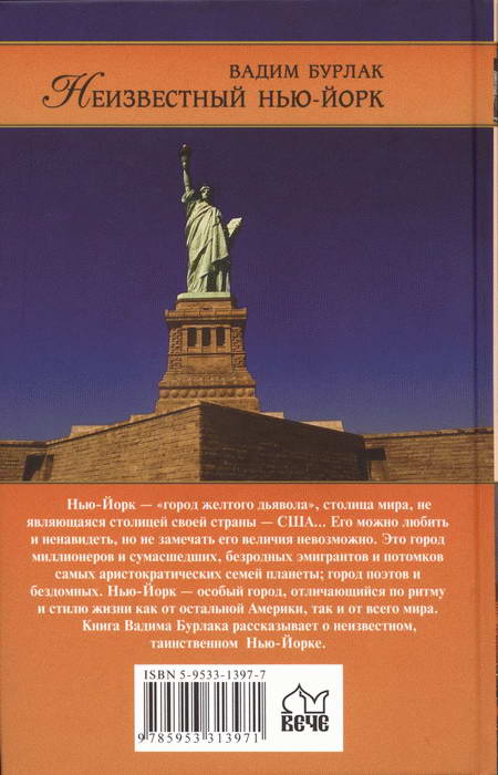 Нью-Йорк — «город желтого дьявола», столица мира, не являющаяся столицей своей страны — США… Его можно любить и ненавидеть, но не замечать его величия невозможно. Это город миллионеров и сумасшедших, безродных эмигрантов и потомков самых аристократических семей планеты; город поэтов и бездомных. Нью-Йорк — особый город, отличающийся по ритму и стилю жизни как от остальной Америки, так и от всего мира. Книга Вадима Бурлака рассказывает о неизвестном, таинственном Нью-Йорке.