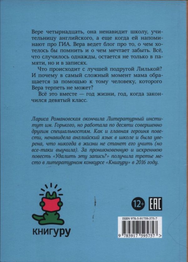 Вере четырнадцать, она каждый день пишет новую заметку и выкладывает запись с тегом — это флешмоб «100 дней счастья»! Сначала кажется, что 365 дней в году можно считать счастливыми сразу, если уволится нелюбимая учительница и все разом перестанут твердить про ГИА. Но к концу учебного года некоторые посты хочется удалить уже не только из блога, но и из жизни — от них становится грустно или стыдно, всё то, что Вера записала раньше, уже как будто мысли другого человека… Лариса Романовская окончила Литературный институт им. Горького, но работала по десяти совершенно другим специальностям. Как и главная героиня повести, ненавидела английский язык в школе и была уверена, что никогда в...