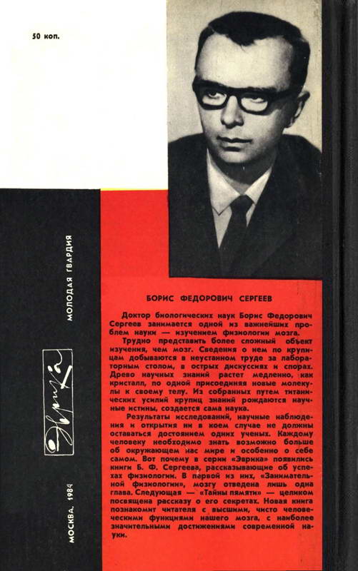 Доктор биологических наук Борис Федорович Сергеев занимается одной из важнейших проблем науки – изучением физиологии мозга и высшей нервной деятельности. Его перу принадлежит около ста научных работ, посвященных функциям центральной нервной системы, а также несколько научно-популярных книг: «Занимательная физиология», «Тайны памяти», «Живые локаторы океана», «Мир амфибий» и другие. Книга «Парадоксы мозга» – первая в серии Лениздата «Раскрывая тайны психики». Задача книги – убедить читателя в познаваемости функций мозга, человеческой психики. Автор рассказывает об истории исследования мозга с древности до нашего времени, доказывает несостоятельность религиозных взглядов на эту область...