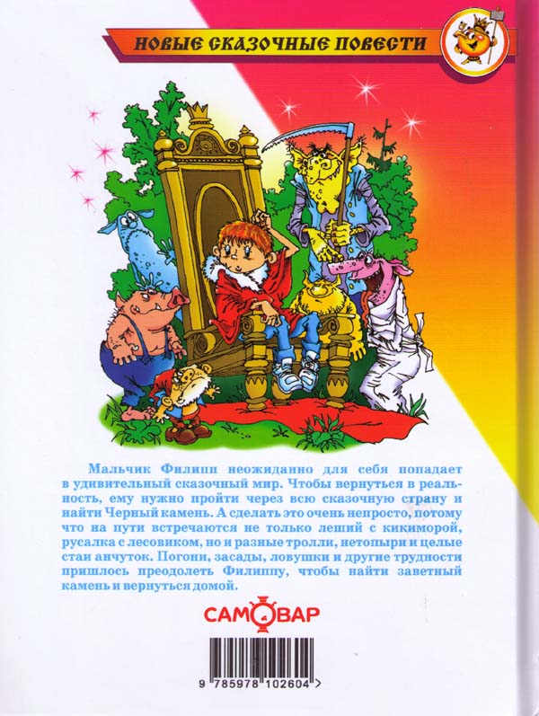 Мальчик Филипп неожиданно для себя попадает в удивительный сказочный мир. Чтобы вернуться в реальность, ему нужно пройти через всю сказочную страну и найти Черный камень. А сделать это очень непросто, потому что на пути встречаются не только леший с кикиморой, русалка с лесовиком, но и разные тролли, нетопыри и целые стаи анчуток. Погони, засады, ловушки и другие трудности пришлось преодолеть Филиппу, чтобы найти заветный камень и вернуться домой. Источник: https://rutracker.org/forum/viewtopic.php?t=4330187