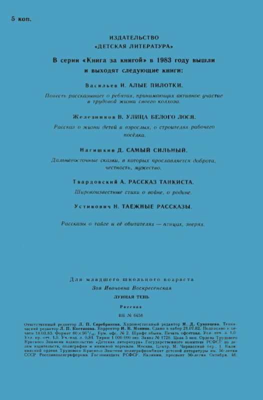 Рассказ о жизни семьи Ульяновых в Кокушкино. Рисунки С.Трофимова. Содержание: Дорогие читатели! (об авторе) Зоя Воскресенская. Лунная тень (рассказ) Для младшего школьного возраста