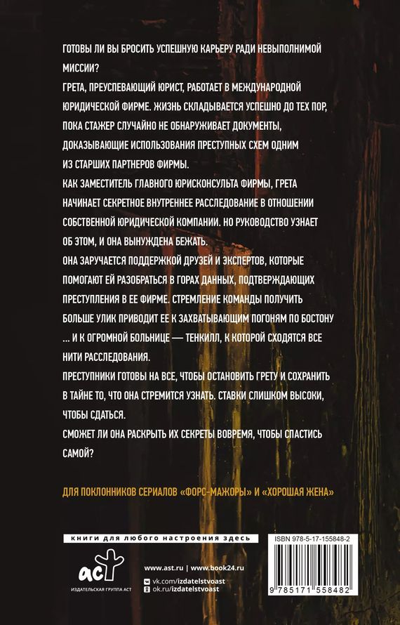 Готовы ли вы бросить успешную карьеру ради невыполнимой миссии? Грета, преуспевающий юрист, работает в международной юридической фирме. Жизнь складывается успешно до тех пор, пока стажер случайно не обнаруживает документы, доказывающие использования преступных схем одним из старших партнеров фирмы. Как заместитель главного юрисконсульта фирмы, Грета начинает секретное внутреннее расследование в отношении собственной юридической компании. Но руководство узнает об этом, и она вынуждена бежать. Она заручается поддержкой друзей и экспертов, которые помогают ей разобраться в горах данных, подтверждающих преступления в ее фирме. Стремление команды получить больше улик приводит ее к...