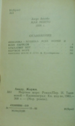 «Я хочу поведать вам сегодня истории, что сказываются и поются на баиянских пристанях. Старые моряки, латающие утлые паруса, капитаны парусных шхун, негры с татуированной кожей, бродяги и мошенники знают наизусть эти истории и эти песни. Я не раз слушал их лунною ночью на баиянской набережной против рынка, во время ярмарок, у причалов малых гаваней побережья, возле огромных шведских судов в Ильеусском порту. Людям моря есть что порассказать… Море — это великая тайна, постичь которую не могут даже старые моряки». Содержание: — Ж. Амаду. «Мертвое море» (роман), стр. 3—363; — В. Кутейщикова. «Фантазия земли и духа» (очерк), стр. 364–368.