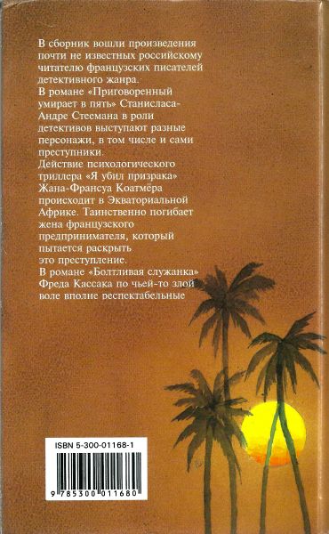 В сборник включены романы почти неизвестных российскому читателю французских писателей детективного жанра. В романе «Приговоренный умирает в пять» в роли детективов выступают разные персонажи, в том числе и сами преступники. Действие романа «Я убил призрака» происходит в Экваториальной Африке. В «Болтливой служанке» по чьей-то злой воле вполне респектабельные люди вовлечены в круг шантажа.