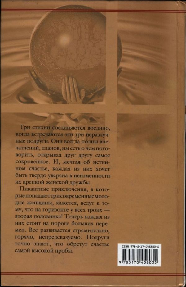 Три стихии соединяются воедино, когда встречаются эти три неразлучные подруги. Они всегда полны впечатлений, планов, им есть о чем поговорить, открывая друг другу самое сокровенное. И, мечтая об истинном счастье, каждая из них хочет быть твердо уверена в неизменности их крепкой женской дружбы. Пикантные приключения, в которые попадают три современные молодые женщины, кажется, ведут к тому, что на горизонте у всех троих — вторая половинка! Теперь каждая из них стоит на пороге больших перемен. Все развивается стремительно, горячо, непредсказуемо. Подруги точно знают, что обретут счастье самой высокой пробы.