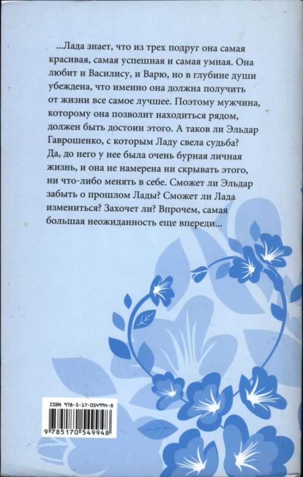 …Лада знает, что из трех подруг она самая красивая, самая успешная и самая умная. Она любит и Василису, и Варю, но в глубине души убеждена, что именно она должна получить от жизни все самое лучшее. Поэтому мужчина, которому она позволит находиться рядом, должен быть достоин этого. А таков ли Эльдар Гаврошенко, с которым Ладу свела судьба? Да, до него у нее была очень бурная личная жизнь, и она не намерена ни скрывать этого, ни что-либо менять в себе. Сможет ли Эльдар забыть о прошлом Лады? Сможет ли Лада измениться? Захочет ли? Впрочем, самая большая неожиданность еще впереди…