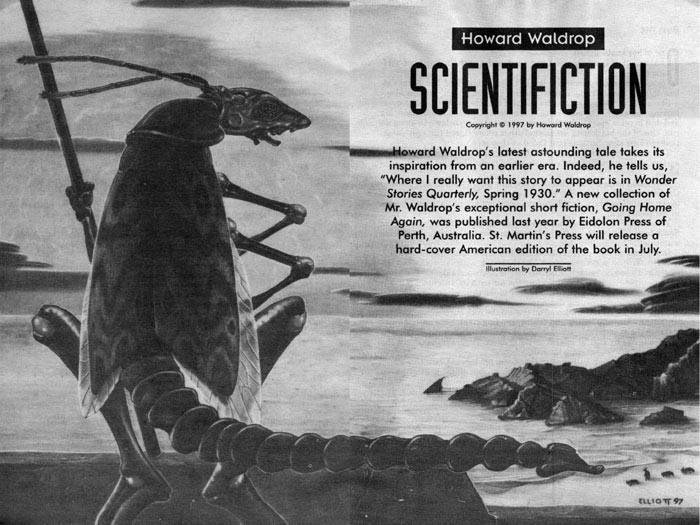 Howard Waldrop’s latest astounding tale takes its inspiration from an earlier era. Indeed, he tells us, “Where I really want this story to appear is in Wonder Stories Quarterly, Spring 1930.” A new collection of Mr. Waldrop’s exceptional short fiction, Going Home Again, was published last year by Eidolon Press of Perth, Australia. St. Martin’s Press will release a hard-cover American edition of the book in July.